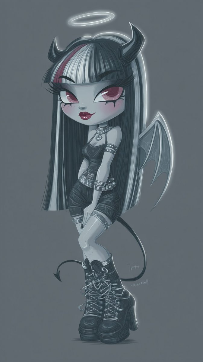 Очаровательная демоница Дракулаура предстает перед нами в яркой и детализированной иллюстрации, выполненной в неповторимом стиле известных художников Meryle Ventures и Tim Shumate. Ее длинные волосы с игривыми баночками обрамляют лицо, выражающее сложную смесь эмоций - от лукавого озорства до едва уловимой угрозы. Дракулаура облачена в костюм Лилит из мультфильма 'Спутник Сатаны', подчеркивая ее связь с темными силами и добавляя образу загадочности. Изящные украшения дополняют образ, а выразительный макияж – черная подводка для создания эффектных стрелочек и яркая красная помада – акцентируют внимание на ее соблазнительных чертах. Фон в темных серых тонах создает драматический контраст с насыщенными цветами – красным, черным и белым, которые доминируют в композиции. Вся иллюстрация пронизана духом темного фэнтези, создавая атмосферу таинственности и приключения. Выражение ее лица демонстрирует некую злорадную уверенность, словно она знает секрет, который недоступен смертным. Это портрет полной фигуры, в котором каждый элемент тщательно продуман для создания запоминающегося образа. Работа выполнена с высоким уровнем детализации, что позволяет рассмотреть мельчайшие нюансы внешности и костюма Дракулаур, делая ее образ по-настоящему живым и привлекательным. Использование высококонтрастных цветов делает иллюстрацию визуально яркой и запоминающейся, подчеркивая ее уникальность и стиль. Общий тон работы – это смесь милоты и мрачности, что характерно для эстетики Monster High