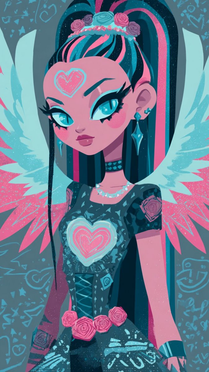 Розовые волосы и крылья ангела: мрачная красотка в стиле Monster High - Пример изображения, сгенерированного нейросетью Midjourney