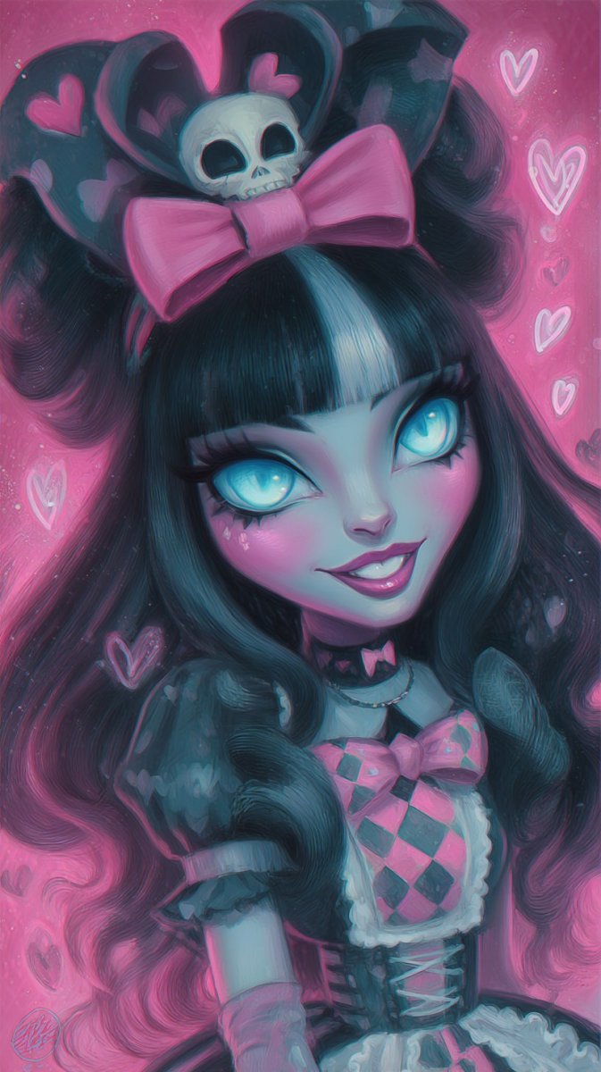 Завораживающая иллюстрация в нежных розовых и насыщенных черных тонах представляет очаровательную Дракулару из Monster High. Она одета в готический наряд, дополненный огромным бантинным головным убором, и позирует рядом со своим питомцем – летучей мышью с маской черепа. Ее улыбка демонстрирует острые зубы, а длинные волнистые волосы обрамляют большое выразительное лицо с ярким голубым макияжем глаз. Мягкое освещение подчеркивает темные тени вокруг головы и создает эффект сияния красным за глазами. Белоснежная фарфоровая кожа Дракулары контрастирует с фоном, усеянным сердцами и летающими летучими мышами. Яркие цвета и сочетание мультяшного стиля с элементами реализма создают неповторимую атмосферу. Ее платье напоминает наряд из Алисы в Стране чудес, украшенное сердечками и клетчатым узором. В воздухе парят розовые облака, добавляя легкости и сказочности композиции. Иллюстрация выполнена в формате 3D-рендеринга с высокой детализацией и безупречной композицией, что делает ее настоящим произведением искусства. Подпись 'angel' придает ей ангельский образ, несмотря на готическую тематику. Каждая деталь проработана до мелочей, создавая ощущение волшебства и очарования. Это яркий пример творчества с использованием сложной графики и запоминающегося персонажа из вселенной Monster High