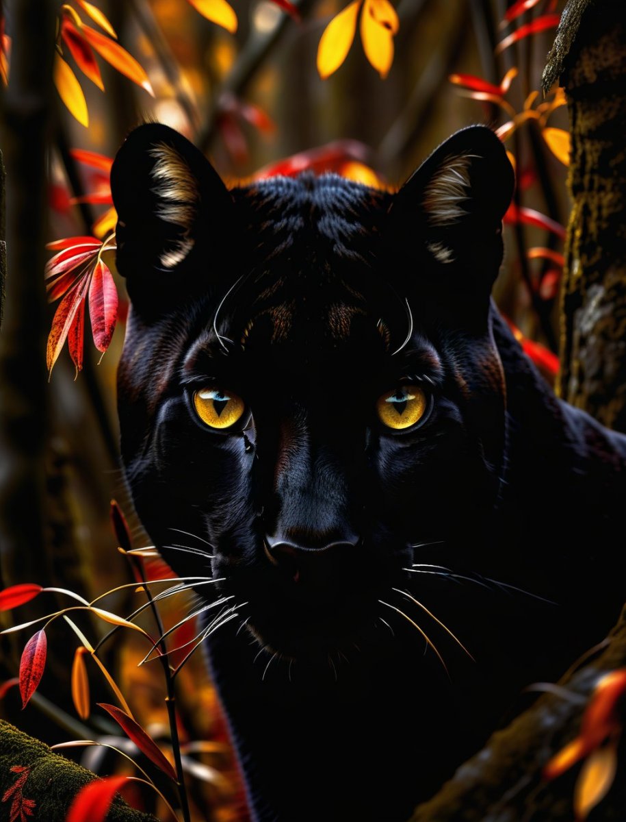 В глубине мощного глаза черной пумы раскрывается завораживающий осенний пейзаж, созданный в виде трехмерного боди-арта. Ирис превращается в окно в золотистый и багряный лес, где преобладают оттенки (#DAA520) и (#DC143C), словно запечатленные последние лучи уходящего солнца. Внутри этого поразительного взгляда прослеживаются замысловатые племенные узоры, добавляющие глубины и загадочности композиции. Фотореалистичная детализация передает каждую текстуру шерсти пумы и каждый лист осенней листвы с потрясающей точностью. Это драматичное изображение дикой природы, выполненное в разрешении 8K, поражает своей реалистичностью и художественной выразительностью. Зритель погружается в мир гармоничного сочетания силы хищника и красоты природы, наблюдая за осенним великолепием через призму животного взгляда. Изображение вызывает ощущение благоговения перед мощью и красотой дикой природы, демонстрируя уникальный сплав искусства и фотографии. Этот боди-арт не только визуально впечатляет, но и передает глубокий символизм связи человека с природой и уважения к ее обитателям. Использование ярких цветов и сложных узоров создает ощущение движения и жизни внутри неподвижного взгляда пумы, делая эту работу поистине незабываемой