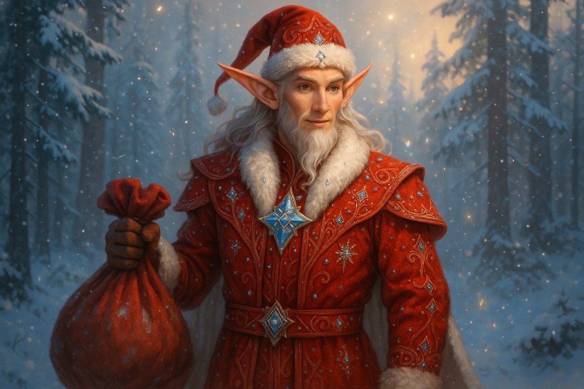 Волшебное переплетение фэнтези и праздника! Представлен величественный эльф, неожиданно перевоплотившийся в зимнего волшебника – Деда Мороза. Его характерные длинные остроконечные уши скромно выглядывают из-под ярко-красной шапки, намекая на его истинное происхождение. Изящный новогодний костюм, словно сотканный из сказочных нитей, украшен причудливыми узорами и мерцающими кристаллами, подчеркивающими его благородство и магическую природу. В руках эльф-Дед Мороз несет мешок, доверху наполненный чудесами и подарками для тех, кто верит в волшебство. Завораживающий зимний лес служит идеальным фоном для этой необычной картины, создавая атмосферу таинственности и сказки. Мягкое сияние магии окутывает все вокруг, подчеркивая неземную красоту эльфа и наполняя сцену волшебством. Каждое движение, каждая деталь продумана до мелочей, благодаря чему создается ощущение реальности происходящего. Этот трехмерный рендер в стиле фэнтези – настоящее произведение искусства, которое переносит зрителя в мир грез и чудес, где эльфы и Деды Морозы живут бок о бок, даря радость и веру в сказку каждому, кто откроет свое сердце для волшебства зимних праздников. Это визуально потрясающая иллюстрация, сочетающая в себе элементы традиционного рождественского образа с элементами фэнтезийной эстетики, создавая уникальное и незабываемое впечатление