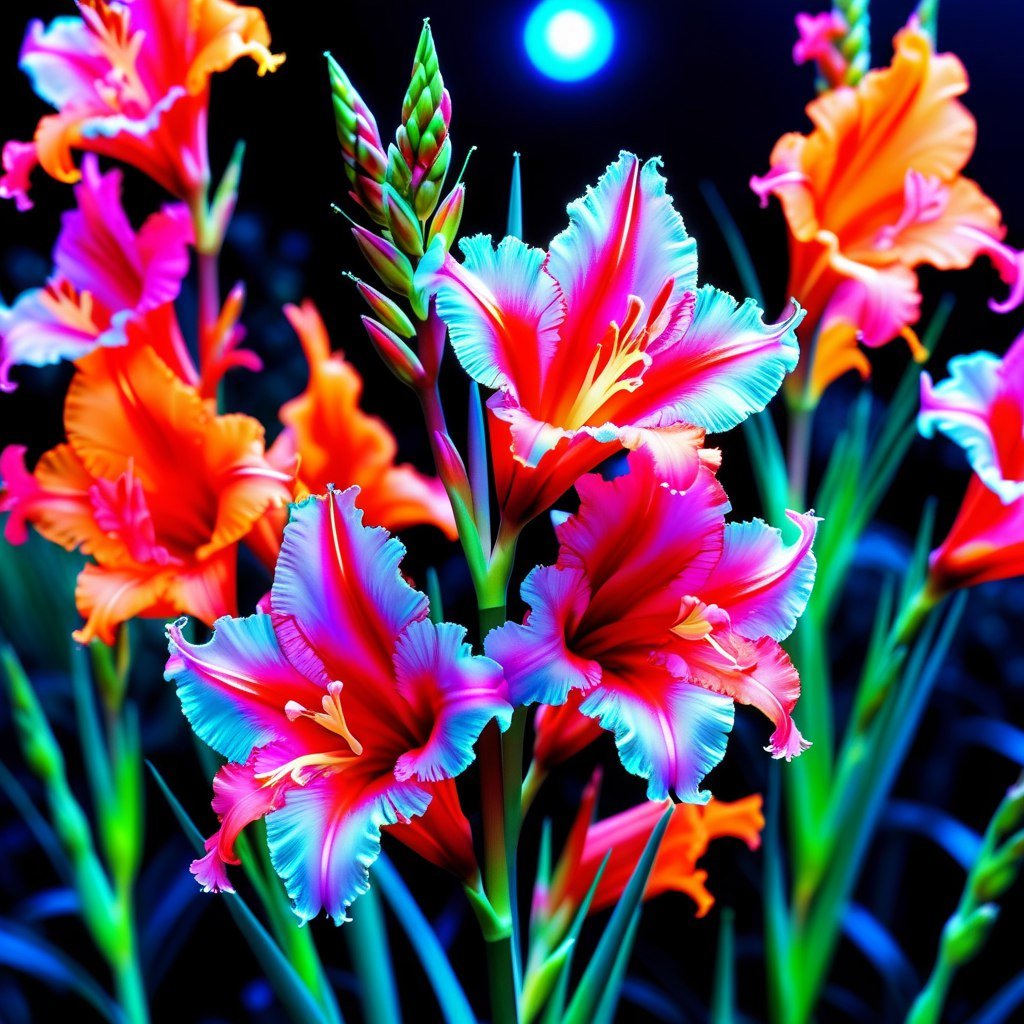 неоновые красивые инопланетные гладиолусы в саду на другой планете , sweet botanical , неоновые нити, сияние, glitter, лучшее качество