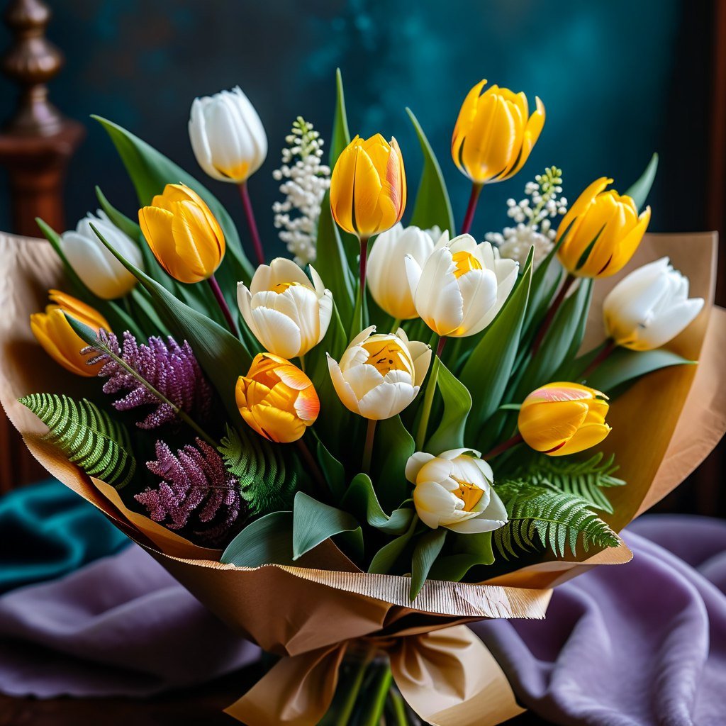 Изысканный букет из нежных цветов станет прекрасным украшением любого торжества или просто порадует близкого человека. В его состав вошли яркие желтые тюльпаны, символизирующие весну и новые начинания, утонченные лиловые оттенки, добавляющие нотку романтики и загадочности, белоснежные розы – воплощение чистоты и искренней любви, а также воздушные листья папоротника, придающие композиции легкость и естественность. Особое внимание привлекает элегантная обертка, подчеркивающая изысканность всего букета. Максимальное качество изображения позволяет рассмотреть каждую деталь: бархатистые лепестки, нежную текстуру цветов и притягательный блеск бордовых жемчужин фонмп, гармонично дополняющих общий ансамбль. Этот флористический шедевр – настоящее произведение искусства, созданное для того, чтобы дарить радость и восхищение своей красотой. Он идеально подойдет в качестве подарка на день рождения, юбилей, свадьбу или просто без повода, чтобы выразить свои чувства и внимание к дорогому человеку. Нежный аромат и неповторимый вид этого букета оставят незабываемые впечатления и подарят хорошее настроение на долгое время. Каждый цветок подобран с любовью и вниманием к деталям, что делает этот букет по-настоящему особенным и уникальным