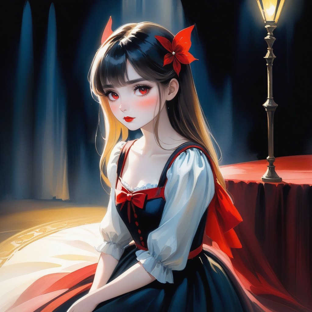 A girl with painted red cheeks, like a theater actress, sits on a dark stage among the scenery, playing a sad role, a tear on her cheek, the spotlight is directed exclusively at her, she is the center of attention, semi-darkness, professional work in watercolor with accentuated strokes of acrylic, smooth features, a bold mood of the painting