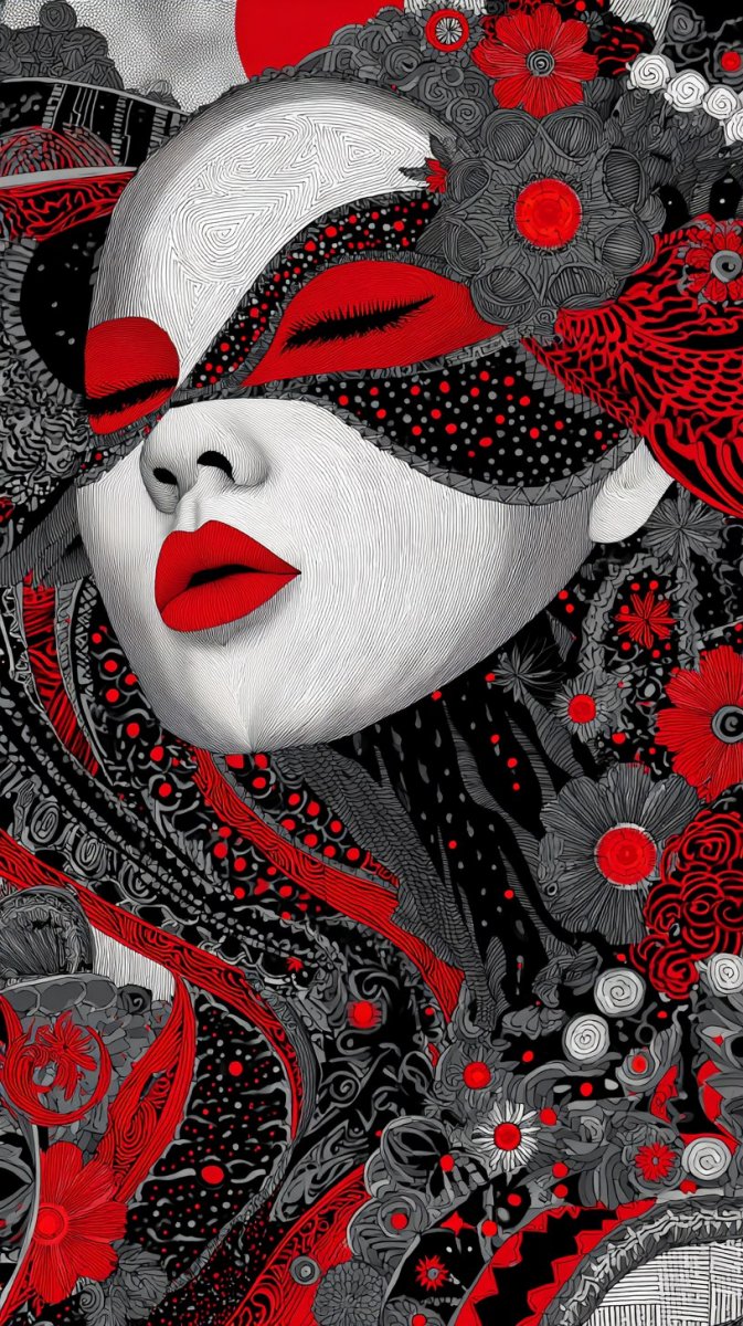 Загадочный портрет женщины, сотканный из вихря узоров и смелых цветовых решений, погружает зрителя в мир иллюзий и фантазий. Лицо, словно маска, украшено замысловатыми спиралями, выполненными в алом и черном, создавая эффект завораживающей двойственности. Губы, подведенные яркой красной помадой, притягивают взгляд, а закрытые глаза намекают на сокровенные мысли и эмоции. Волосы ниспадают волнами, украшенные изящными цветочными мотивами, подчеркивающими неземную красоту образа. На фоне бушующего красного неба, усеянного белыми облаками, едва различим силуэт городского пейзажа, добавляющий композиции глубины и динамизма. Мастерски выполненная иллюстрация отличается смелым стилем и драматизмом, создавая ощущение оптической иллюзии. Тончайшая филигранная работа прослеживается в каждой детали, от линий подводки глаз до градиентного перехода черных и белых тонов, усыпанных мерцающими красными камнями. Контраст между черным и белым создает эффектный визуальный акцент, усиливая загадочность и притягательность образа. Вся композиция пронизана атмосферой сюрреализма, приглашая зрителя в путешествие по миру фантазий и грез, где реальность переплетается с иллюзией, а красота обретает новые формы и грани. Это не просто портрет – это визуальная поэма, посвященная таинственности женской души и силе воображения