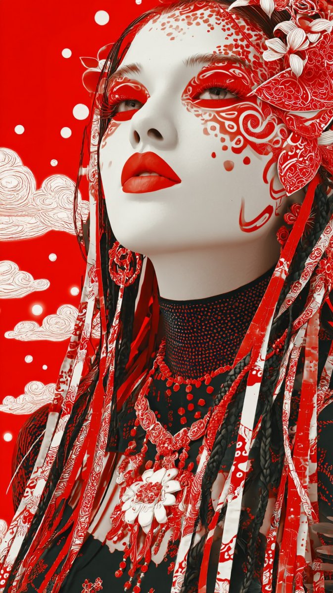 Изысканный портрет женщины, воплощающий собой смелый синтез современности и древних традиций. Лицо, словно холст для виртуозного макияжа, украшено богатой палитрой белого, черного и алого цветов, создавая эффектную игру контрастов. Яркая красная помада подчеркивает чувственность губ, а насыщенные тени придают взгляду глубину и загадочность. Длинные струящиеся волосы украшены сложными узорами, напоминающими замысловатые цветочные орнаменты и витиеватые спирали, что придает образу неповторимую элегантность. На фоне бушующего алого неба с пушистыми белыми облаками вырисовывается силуэт современного мегаполиса, добавляя динамизма и масштабности композиции. Вся картина пронизана смелым и драматичным стилем, где каждый элемент тщательно продуман и гармонично сочетается друг с другом. Впечатление маски, будто лицо заключено в произведение искусства, усиливает ощущение загадочности и таинственности. Это не просто портрет, а визуальная поэма, посвященная красоте, силе и безграничной фантазии художника. Композиция захватывает внимание своей смелостью и оригинальностью, сочетая в себе элементы классической живописи и современного дизайна, создавая поистине завораживающий образ
