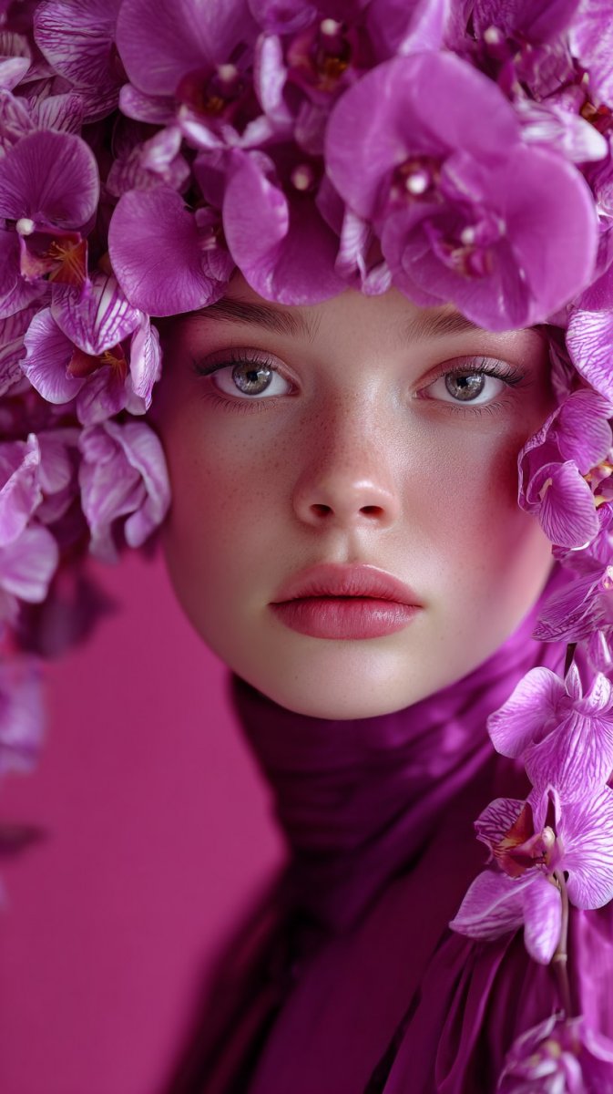 #2. fashion model, photorealistic, look at the viewer, bright solid magenta background, ethereal floral crown crafted from bioluminescent orchids, delicate porcelain skin texture, shallow depth of field, soft diffused lighting – captured with a Canon EOS R5 and RF 85mm f/1.2L USM lens #role_girls