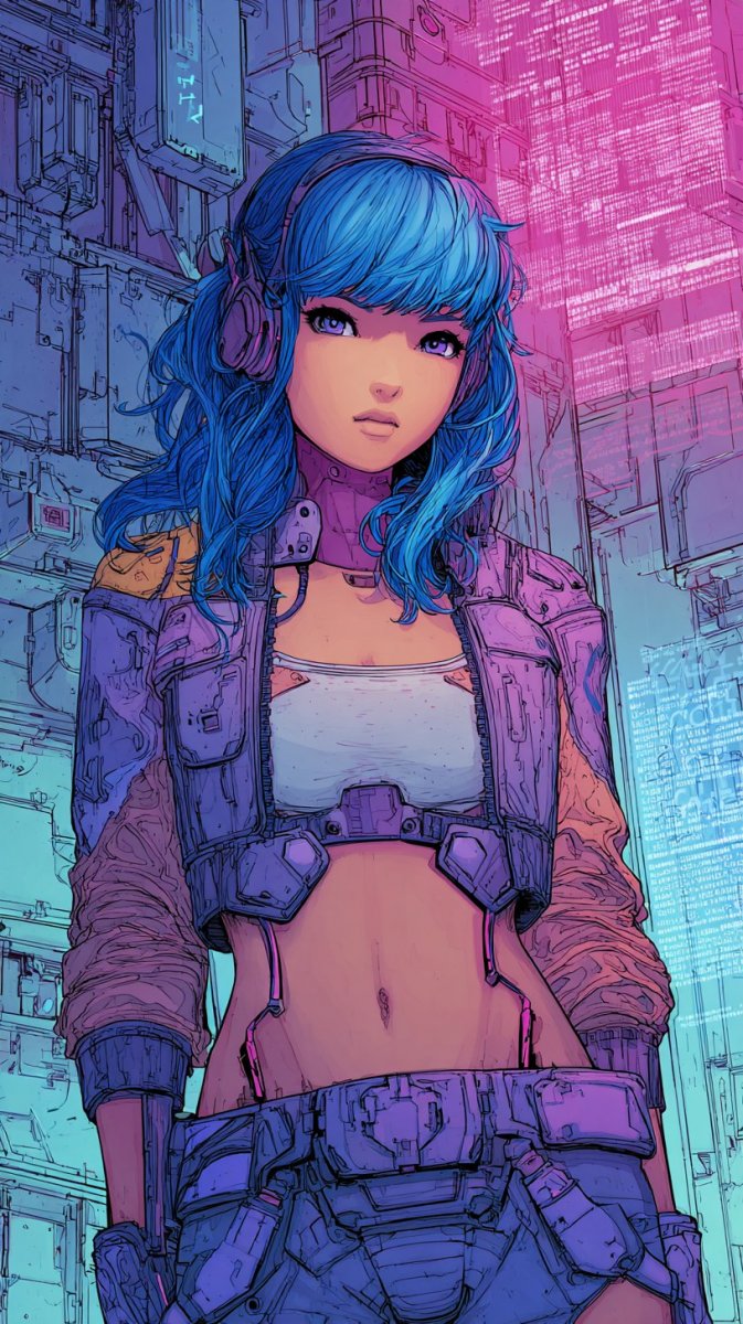 #2 ink drawing, illustration, anime style, striking girl with vibrant blue hair, adorned with futuristic cybernetic enhancements, wearing sleek armor, standing confidently amidst a neon-lit cityscape, colorful holograms surrounding her, high detail on urban textures, bg is a bustling cyberpunk metropolis #Role_anime_girl