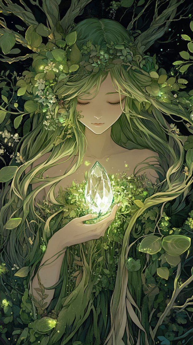 Загадочная лесная нимфа, сотканная из света и тени, предстает в этом завораживающем рисунке. Её длинные струящиеся волосы цвета изумруда переплетены с виноградными лозами и нежными цветами, словно она сама является частью этого волшебного леса. Платье, вытканное из листьев и мха, гармонирует с окружающей средой, делая её практически неразличимой среди деревьев. В руках она держит светящийся посох, украшенный кристаллами, излучающий мягкое сияние, которое освещает танцующих вокруг неё лесных духов – пикси и фей, играющих в лунном свете. Атмосфера наполнена волшебством и умиротворением благодаря биолюминесцентной флоре и фауне, создающей невероятное зрелище. Яркая палитра из оттенков зеленого, коричневого и золотого усиливает ощущение сказочности и гармонии. Выражение лица девушки спокойное и безмятежное, словно она хранит в себе тайны древних легенд. Вдохновленный фильмами о принцессе Моноке и древними фольклорными мотивами, этот рисунок поражает своей детализацией, четкостью пропорций и симметрией композиции. Студийное освещение подчеркивает драматизм позы девушки, а резкий фокус акцентирует внимание на каждой детали её образа и окружающего пейзажа. Это не просто иллюстрация – это окно в волшебный мир, где природа и магия сливаются воедино, создавая неповторимое ощущение чуда и красоты. Полное изображение демонстрирует всю полноту и великолепие этого фантастического существа, являющегося воплощением гармонии и силы природы