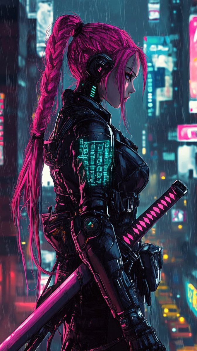 ink drawing, illustration, anime style cyberpunk samurai girl with neon pink hair styled in intricate braids, wearing sleek black armor accented with glowing turquoise circuitry, wielding a katana that crackles with energy, determined expression, standing on rooftop overlooking sprawling futuristic city, rain-slicked streets reflecting vibrant holographic billboards, gritty urban aesthetic, inspired by ghost in the shell and akira, high detail, clear proportions, symmetry, studio light, professional, dramatic pose, sharp focus, full body #role_anime_girl