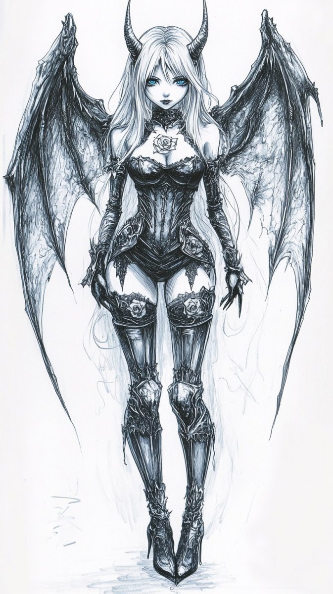 Завораживающая иллюстрация в стиле аниме представляет собой образ роковой красавицы – девушки с небесно-голубыми глазами и длинными струящимися волосами, сочетающей в себе черты ангела и демона. Ее соблазнительный наряд состоит из бронированного бикини, подчеркивающего безупречную фигуру, высоких каблуков, добавляющих образу элегантности и уверенности, а также чулок выше колена, завершающих этот дерзкий ансамбль. Острые ушки и крылья намекают на ее неземное происхождение, в то время как татуировка в виде розы на руке придает ей загадочности и индивидуальности. Девушка уверенно смотрит прямо на зрителя, принимая драматичную позу, которая подчеркивает ее силу и привлекательность. Идеально подобранный готический топ дополняет образ, а корсет из рыболовной сети и чокер добавляют пикантности. Реалистичный стиль прорисовки в сочетании с использованием Octane rendering создает потрясающий визуальный эффект, делая эту девушку похожей на ослепительную готическую топ-модель, сошедшую со страниц фэнтезийного журнала. Каждый элемент тщательно продуман и выполнен с невероятной детализацией, чтобы передать всю красоту и силу этого уникального персонажа, воплощающего собой идеальное сочетание нежности и опасности, ангельского очарования и демонического соблазна. Это визуальный шедевр, который никого не оставит равнодушным