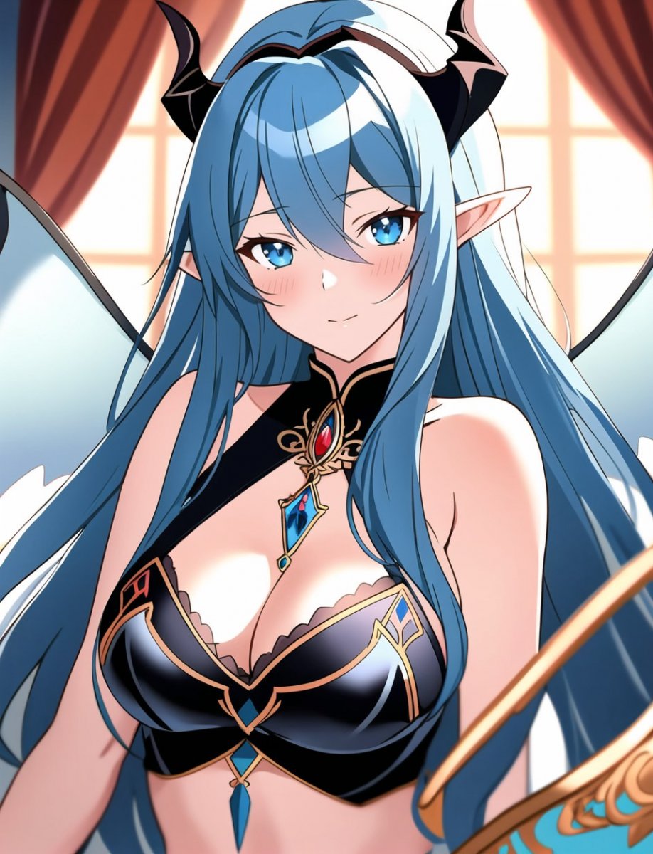Загадочная красавица с небесно-голубыми глазами, воплощение древней славянской мифологии. Перед зрителем предстает чарующая девушка, словно сошедшая со страниц старинных легенд. Ее длинные волосы ниспадают волнами, обрамляя лицо, полное таинственности и силы. Легкая бикини-броня подчеркивает ее грациозную фигуру, а изящная плечевая защита добавляет образу воинственности и загадочности. Острые ушки намекают на ее неземное происхождение, а крылья, словно сотканные из теней, придают ей ангельский, но в то же время демонический вид. Высокие чулки плотно облегают стройные ноги, добавляя пикантности и соблазна. Взгляд, устремленный прямо на зрителя, пронзает душу, заставляя задуматься о ее истинной сущности. Искусное красное украшение, словно языки пламени, подчеркивает ее красоту и загадочность. Сложная филигранная работа и цветочный орнамент придают образу неповторимый шарм и изысканность, отсылая к древним русским традициям. Идеальное освещение студии создает драматическую атмосферу, выделяя каждую деталь ее внешности. Поза, полная грации и силы, заставляет поверить в ее сверхъестественные способности. Эта девушка – воплощение русской красоты, сочетающей в себе нежность и силу, загадочность и страсть, ангельский свет и демонический огонь. Она словно сошла с холста талантливого художника, чтобы покорить сердца зрителей своей неповторимой красотой и притягательностью. В ее облике переплетаются черты древней русской женщины и фантастические элементы, создавая поистине завораживающий образ