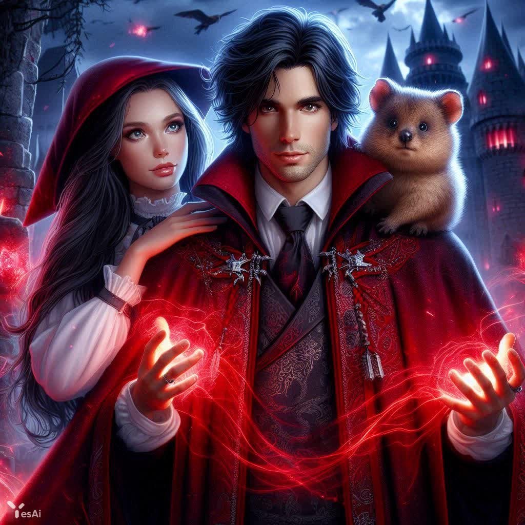 Fantasy. A handsome dark magician 30-35 years old with long black hair, in a rich scarlet mantle with silver runes, conjures red magic flashes from his hands, embraced by his assistant-secretary 25-30 years old in a modern blouse and skirt, with a fluffy quokka sweetly smiling on her shoulder. Her gaze admiring, his focused, both looking at the viewer. Background: a dark castle with towers and weary zombie peasants in ragged clothes, magical glow, vibrant colors with scarlet and black accents, dynamic and mystical atmosphere, hyperrealism, full-length, 1:2