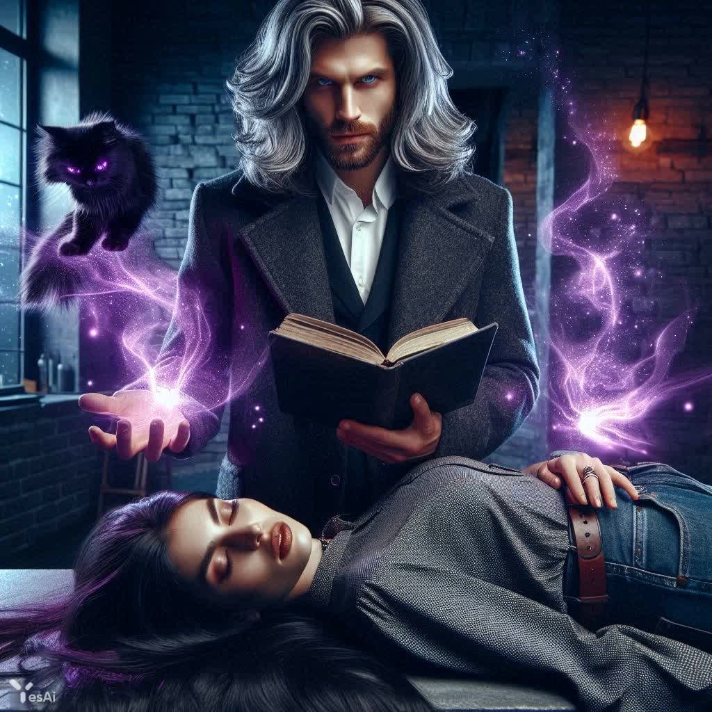 Загадочная встреча двух реальностей в мрачной современности. Перед зрителем предстает мужчина около тридцати лет с длинными серебристыми волнами волос, ниспадающими до пояса и пронзительными голубыми глазами. Его образ сочетает в себе элегантность – белоснежная рубашка и стильный пальто из войлока – и зловещую ауру, подчеркнутую хмурой улыбкой и пристальным взглядом, направленным прямо на наблюдателя. В его руках раскрыт черный блокнот, словно хранящий тайны древних заклинаний. В воздухе мерцают вспышки пурпурного волшебства, создавая ощущение неминуемой опасности и потусторонней силы. На холодном каменном постаменте лежит молодая женщина в возрасте от двадцати пяти до тридцати лет с длинными темными волосами, ее глаза закрыты, а тело облачено в уютный свитер и джинсы – контраст между хрупкостью и загадочностью. Действие разворачивается в современном каменном подвале, освещенном тусклым светом одинокой лампы, которая лишь подчеркивает мистическую атмосферу происходящего. Яркие краски, доминирующие фиолетовый и черный цвета, создают напряженное и таинственное настроение. Гиперреалистичная детализация позволяет зрителю полностью погрузиться в эту сюрреалистичную сцену, ощутить на себе тяжесть момента и почувствовать приближение неизбежного. Вся композиция выдержана в формате полного роста с соотношением сторон 1:2, что добавляет драматизма и подчеркивает масштабность происходящего. Это визуальное повествование о столкновении современности и фантазии, где магия переплетается с реальностью, а судьба главной героини висит на волоске