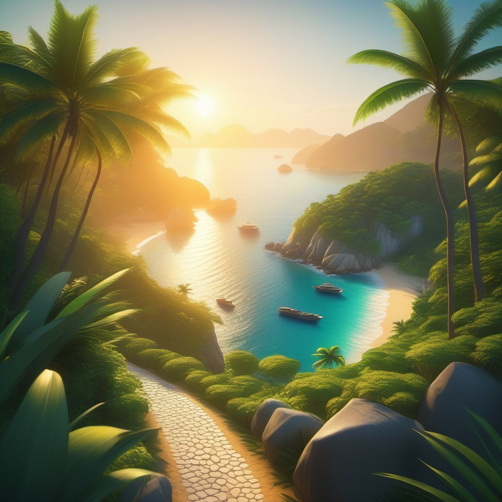 A breathtaking panoramic view of a tropical Vietnamese coastline at sunrise. A winding path paved with weathered stones leads towards the turquoise ocean, flanked by lush palm trees and vibrant green foliage. The path is bordered on one side by a dense row of native trees, their roots intertwining with the stone. Gentle waves lap against the shore, reflecting the golden light of the rising sun. Soft, diffused sunlight filters through the leaves, creating dappled shadows. Warm color palette, cinematic lighting, highly detailed, 8k resolution, photorealistic.