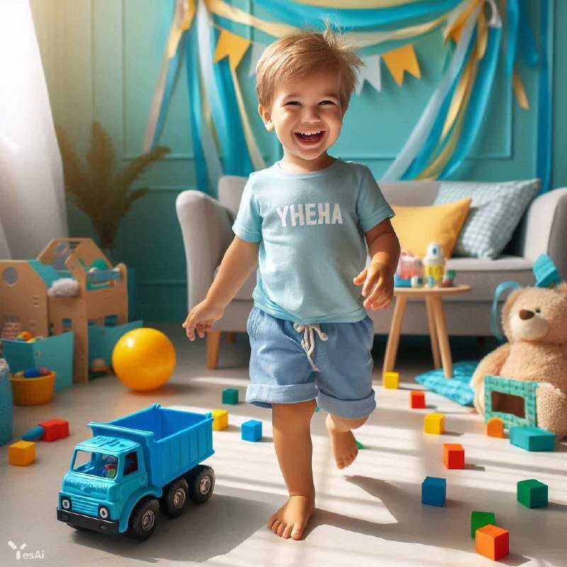Яркое, позитивное профессиональное фото. Мальчик в возрасте одного года бежит босиком по комнате, весело хохоча. За его спиной на полу разбросаны игрушечный грузовик, мяч и разноцветные кубики. На мальчике синяя футболка и шорты. На футболке белая надпись "Zhenia". Волосы светлые растрепаны. В комнате играет солнце, с потолка свисают праздничные ленты и бирюзовые шары. Всё аккуратно, без нагромождений. Настроение беззаботности и счастья. Много воздуха. Чистые яркие цвета. Диафрагма камеры 1.7