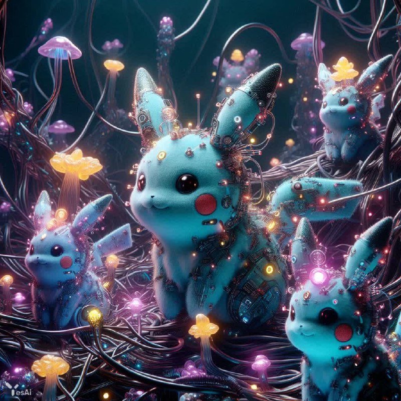 A bustling colony of Pikachu cyborgs, neon circuitry glowing, metallic fur shimmering, tiny robotic arms whirring, playful energy amidst alien flora, bioluminescent fungi illuminating crystalline structures, floating data streams, holographic projections, vibrant cables connecting robotic hearts - Art, CGI, 1024K