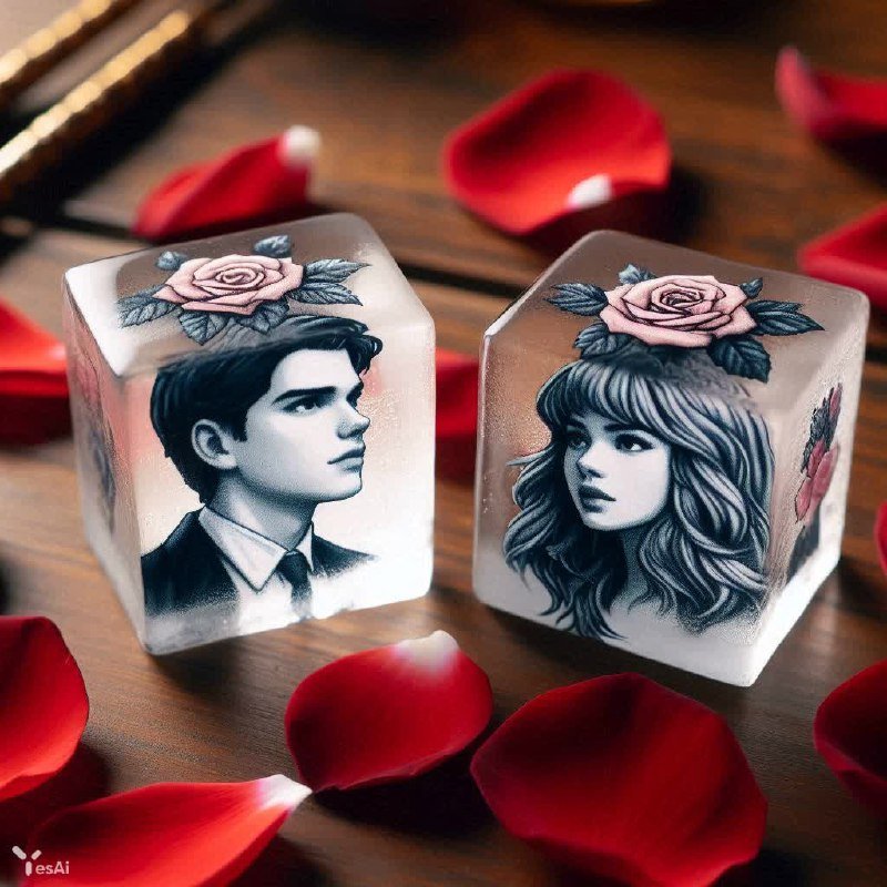 Застывшая страсть в объятиях холода. Два кубика льда становятся холстом для трогательной истории любви, где взгляды парня и девушки встречаются сквозь призму романтики и таинственности. Темный ботанический мотив переплетается с дерзким сочетанием красного и черного на фактурном деревянном фоне, создавая атмосферу загадочной притяженности. Белые облака словно окутывают пару в своей нежной дымке, подчеркивая хрупкость момента. На столе раскинулись лепестки роз – символ вечной любви и страсти, а мелкие стеклянные сердечки добавляют нотку нежности и безмятежности. Эта композиция — воплощение контраста между жаркими чувствами и холодной красотой, запечатленное в мимолетном мгновении. Идеальное сочетание эстетики темного романтизма и нежной чувственности. Это визуальная поэма о любви, где каждый элемент тщательно подобран для создания неповторимой атмосферы. Кажется, будто время остановилось, чтобы позволить нам насладиться этим моментом застывшей красоты и искренних эмоций. Тонкие детали и глубокий символизм делают эту сцену незабываемой. Это не просто изображение – это история любви в ледяном формате