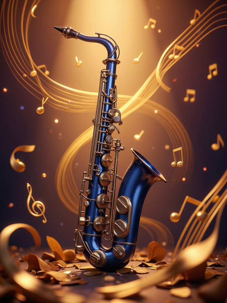 A shiny dark blue saxophone, located in the center of the vertical composition, dominates the image. The instrument, rendered with shiny highlights, is set against a background of swirling gold notes and curved lines imitating sound waves, creating a sense of musical movement. The background has a warm gradient, transitioning from amber in the center to dark burgundy and purple at the edges. Scattered notes, carefully crafted and varying in size, seem to float around the saxophone, creating a sense of dynamism and rhythm. The light source appears to come from behind the saxophone, making the instrument and surrounding elements glow. The metal...