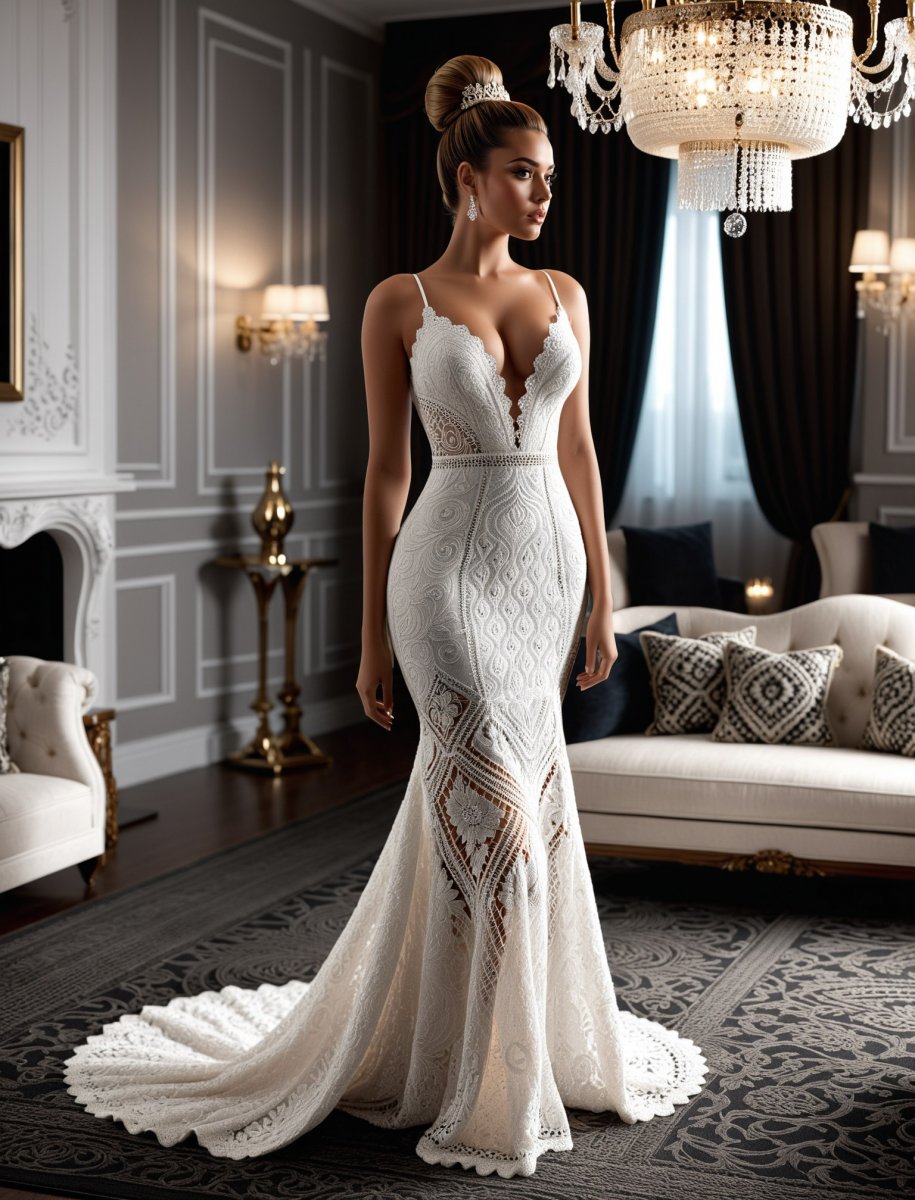 Изысканная красота в белоснежном кружевном великолепии. Перед зрителем предстает женственный образ, воплощенный в элегантной модели с пышными формами. Ее фигура подчеркнута идеально сидящим лифом, а струящаяся юбка создает ощущение невесомости и воздушности. Белый цвет кружевного платья, выполненного с филигранным мастерством, символизирует чистоту и невинность, в то время как сложный узор придает образу неповторимую изысканность. Роскошный интерьер гостиной с хрустальными люстрами служит идеальным фоном для этой сцены, усиливая ощущение роскоши и гламура. Высокий пучок безупречно уложенных волос подчеркивает благородство черт лица модели, а серьезное выражение добавляет глубины и загадочности ее взгляду. Вся композиция пронизана атмосферой элегантности и уверенности в себе. Эта фотография – настоящий гимн женственности и красоты, запечатленный в белом кружеве. Она демонстрирует гармонию между классическим стилем и современными тенденциями, создавая образ, который завораживает своей утонченностью и изысканностью. Это не просто фото, это история о сильной женщине, которая умеет ценить красоту и элегантность в каждой детали. Этот образ является воплощением высокой моды и безупречного вкуса, демонстрируя мастерство художника и талант модели