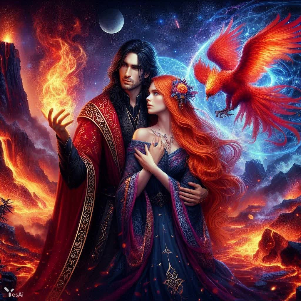 Fantasy. A dark magician male 30 years old with long black hair, in a crimson mantle with gold runes, conjures fire, embraced by his assistant woman 20 years old with long orange hair, in a blue robe with starry patterns, a fluffy phoenix with fiery feathers on her shoulder. Her gaze is admiring, his commanding, both looking at the viewer. Background: a volcano rim with lava and smoke, magical glow, vibrant colors with red, orange, and blue accents, epic and mystical atmosphere, hyperrealism, full-length, 1:2