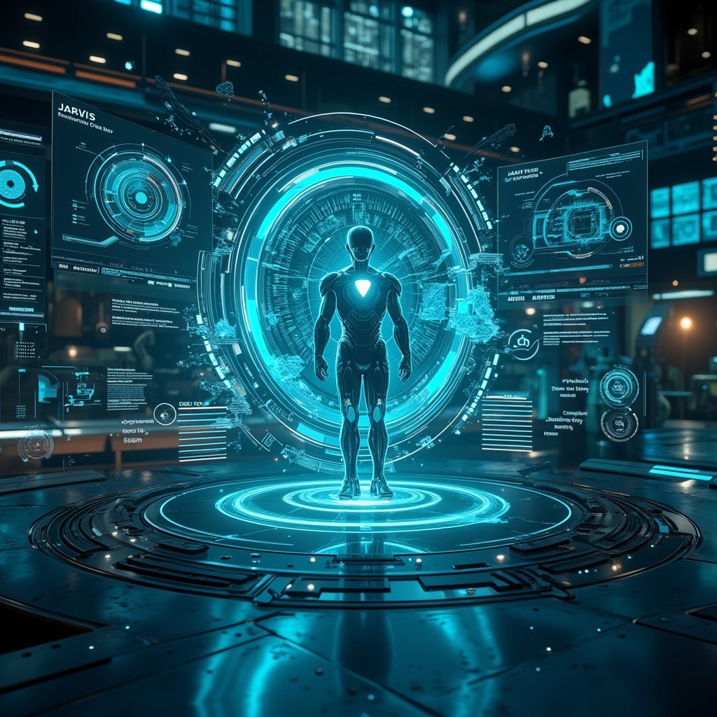 Holographic AI interface (JARVIS from Iron Man) translucent neon-cyan, layered circular HUDs, arc-reactor motifs, sleek sans-serif typography, volumetric light beams, floating data panels inside Tony Stark’s high-tech lab with glass walls, robotic arms, and metallic consoles 3D render. Moody, cool-blue lighting with emissive glow and subtle screen bloom 24mm wide-angle, anamorphic lens, f/2.8, shallow depth of field, cinematic framing, slight lens flare, ray-traced reflections, 8K Octane render, ultra-detailed, high contrast, futuristic tech aesthetic