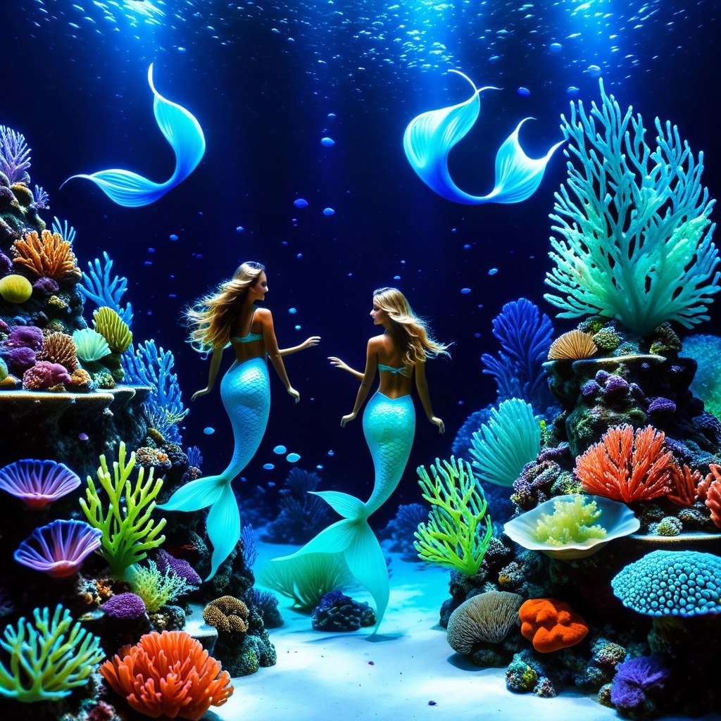 Подводная художественная галерея с русалками-художницами, создающими картины из биолюминесцентного планктона и коралловых скульптур.
