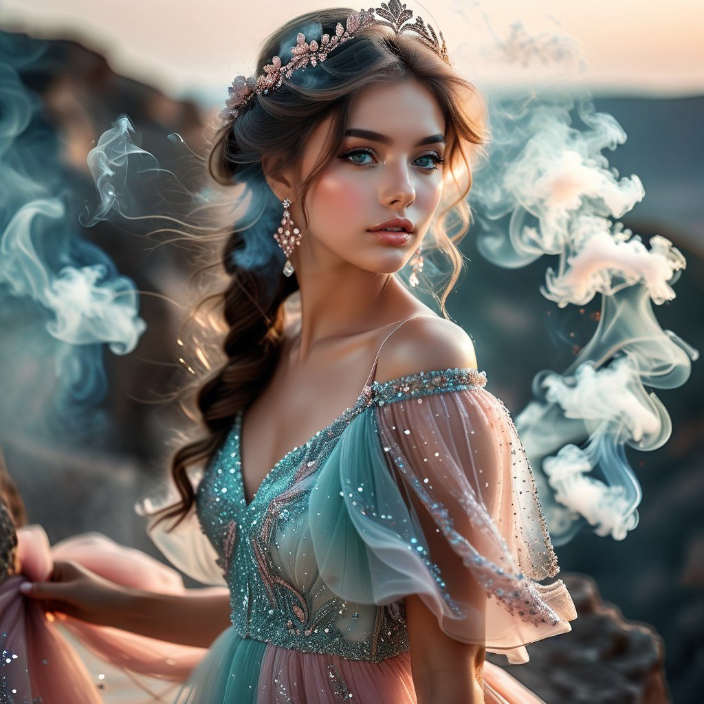 Воплощение нежной красоты и хрупкой элегантности. Перед зрителем предстает молодая девушка в изысканном многослойном платье, сотканном из тончайших тканей. Ее взгляд, исполненный выразительности и чувственности, притягивает внимание, раскрывая внутренний мир, полный загадок и мечтаний. Фигура девушки – это ода эстетике тела, гармонично сочетающаяся с окружающим пейзажем, словно перетекающая в него. Палитра цветов создает атмосферу воздушной нежности: дымчато-розовые оттенки мягко переходят в бежевый и белый, а нежные акценты мятного и бледно-голубого добавляют легкости и свежести. Изящные искры мерцают словно пыль фей, окутывая сцену таинственным сиянием. Это произведение – настоящая поэзия в визуальной форме, воплощающая эстетику красоты во всех ее проявлениях. Высочайшее разрешение изображения (4k) и мельчайшая детализация позволяют рассмотреть каждую деталь: от тонкой вышивки на платье до отражения света в глазах девушки. Профессиональная фотография, сделанная вблизи, подчеркивает естественность и утонченность модели, создавая ощущение личного контакта со зрителем. Это не просто изображение – это мгновение застывшей красоты, передающее тончайшие нюансы эмоций и эстетического наслаждения. Картина излучает спокойствие, гармонию и вдохновение, погружая в мир мечтаний и прекрасного