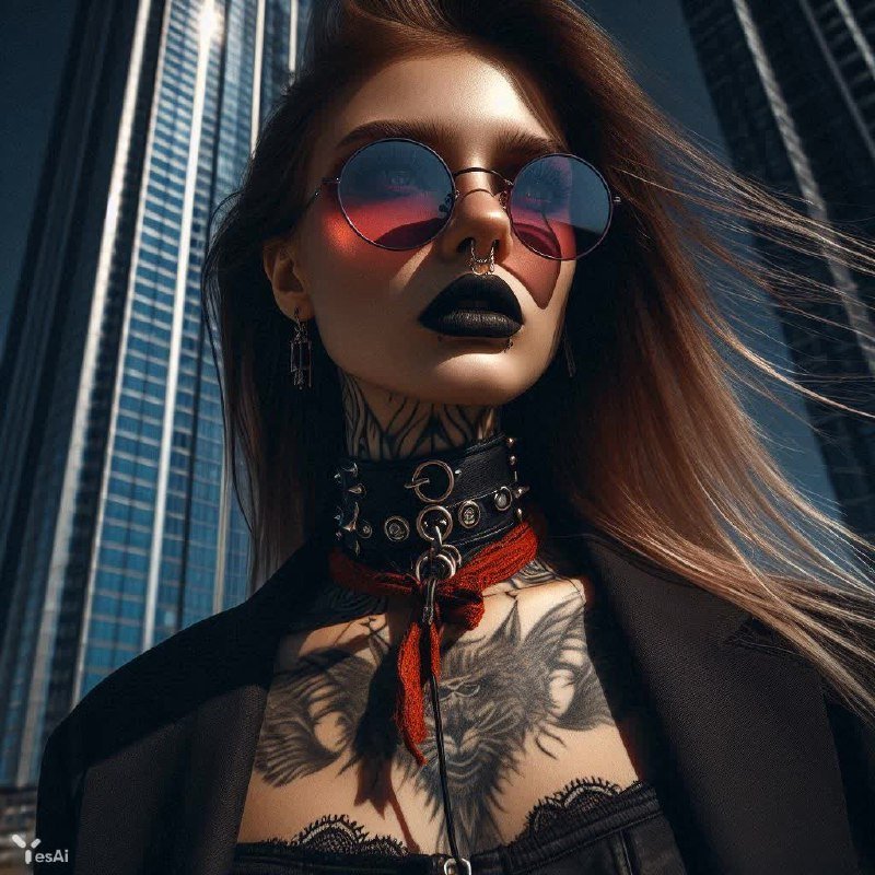 Завораживающая игра света и тени оживает в этом снимке, где молодая женщина становится воплощением готического шика на фоне современной архитектуры. Нижний ракурс подчеркивает ее уверенную осанку и стильный образ – длинные светлые волосы развеваются на ветру, контрастируя с дерзким сочетанием черной кожаной куртки и яркого оранжевого шарфа. Акцент на деталях: чокер, кожанные ремни, клёпки и татуировки создают неповторимый готический стиль, а светоотражающие серебряные очки добавляют загадочности. Насыщенное синее небо и солнечный свет формируют драматический фон для этой урбанистической сцены, где контрасты света и тени подчеркивают силуэт героини и создают эффектную композицию. Фотореалистичное изображение передает каждую деталь с невероятной точностью – от текстуры кожи до отражений в стеклах небоскреба. Этот стильный снимок – ода современной женственности, смелости и индивидуальности, запечатленная в моменте. Безупречный фотограф сумел создать произведение искусства, сочетающее в себе красоту человека и величие городской архитектуры, демонстрируя гармонию между готическим образом и современным мегаполисом. Это больше, чем просто фотография – это история, рассказанная языком света и тени
