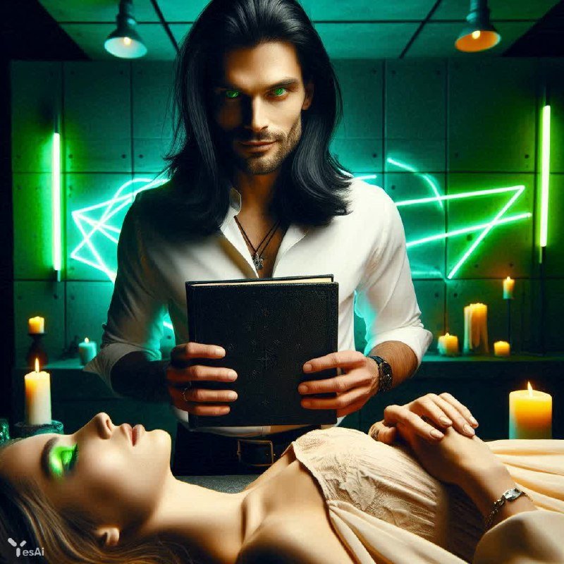 Загадочный колдун в сумрачном подземелье предстает перед зрителем с мрачной улыбкой. Его длинные черные волосы контрастируют с пронзительным взглядом изумрудных глаз, а расстегнутая белая рубашка лишь подчеркивает его некую отстраненность и загадочность. В руках он держит древний фолиант некроманта, словно вмещающий в себя тайны жизни и смерти. Вокруг него вспыхивают неоново-зеленые магические искры, создавая атмосферу напряжения и мистицизма. На каменном алтаре перед ним покоится прекрасная женщина с длинными золотыми волосами, ее лицо спокойно закрыто сомкнутыми веками, а легкое летнее платье создает ощущение хрупкости и беззащитности. Фон представляет собой современный каменный подвал, погруженный в ночную тьму, лишь слабый свет тусклой лампы и магическое свечение подчеркивают готическую атмосферу места. Яркие цвета с неоново-зелеными и черными акцентами создают визуальный эффект гиперреализма, делая сцену особенно захватывающей и запоминающейся. Вся композиция пронизана чувством тревоги и таинственности, погружая зрителя в мир темной магии и древних ритуалов. Этот момент застыл во времени, словно предвещая нечто неизбежное, а взгляд колдуна будто бы проникает в самую душу наблюдателя