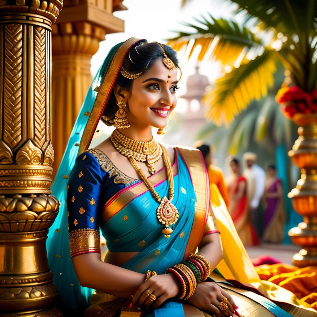 Изысканный свадебный портрет в стиле классической живописи маслом, поражающий своей детализацией и фотореализмом. Изображение запечатлело невесту в уникальном наряде, сочетающем элементы пиратского стиля с традиционными мотивами южноиндийской свадьбы. Рядом с ней восседают две прекрасные героини, напоминающие Нави из игры NieR:Automata, облаченные в элегантные сари и дхоти цвета слоновой кости и золота с богатой золотой отделкой. Атмосфера праздника пропитана улыбками гостей, одетых в гармонирующие цвета, яркими гирляндами из маргариток и теплым солнечным светом, пробивающимся сквозь пальмовые листья. На заднем плане возвышается древний храм, создавая ощущение священности момента. Мягкое боке и сочные краски добавляют изображению живости и глубины. Кожа невесты синего цвета излучает сияние, а замысловатые украшения, золотые элементы и жасмин в волосах подчеркивают её красоту и статус. Богатые тактильные текстуры ткани, позолоты и кожи создают ощущение реализма и присутствия. Портрет выполнен с потрясающей детализацией, освещен кинематографическим светом и передает атмосферу радости и безмятежности. Небольшая глубина резкости, уравновешенная композиция, кристальная ясность и безупречное узнавание деталей делают это произведение настоящим фотореалистичным шедевром, достойным восхищения и увековечивания самого важного дня в жизни