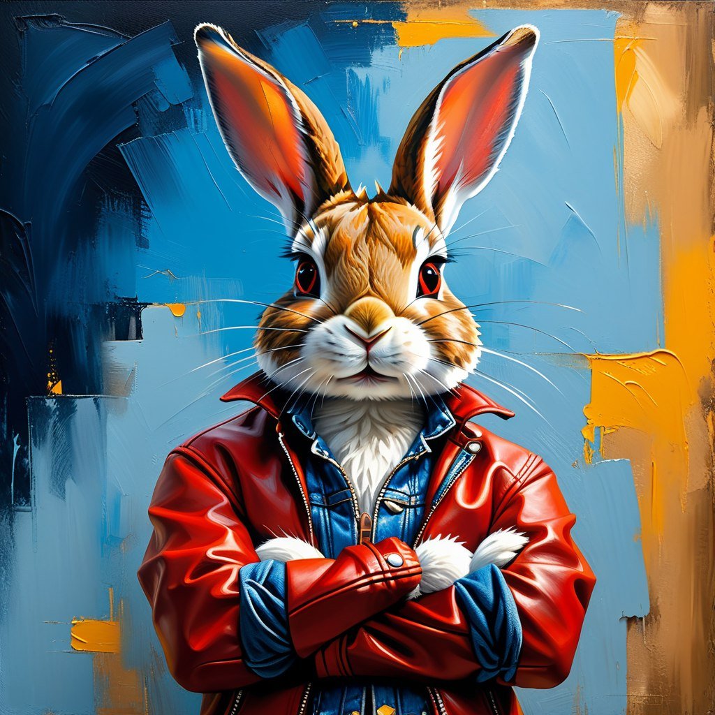 Detailed oil painting, dark fantasy - a confident anthropomorphic rabbit standing with arms crossed, wearing a vibrant red leather jacket and ripped blue jeans. Masterpiece oil style with rich impasto textures and visible expressive brushstrokes, dramatic cinematic lighting, dynamic shadows and golden-hour highlights that bring out tactile details in the rabbit's fur and clothing. Warm color palette enhancing painterly realism; minimal neutral background with textured abstract elements to keep focus on the bold, charismatic character. High detail, textured brushwork, raw and unpolished aesthetic, original character design, avoid copying any s...