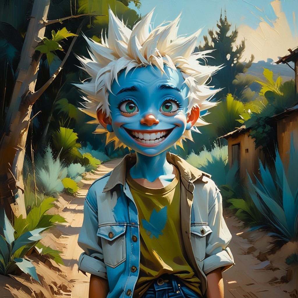 Яркий и экспрессивный образ персонажа в стиле темного фэнтези, запечатленный масляной живописью с акцентом на текстуру и детализацию. Центральная фигура – необычный герой с голубой кожей и взъерошенной белой шевелюрой, выделяющийся благодаря гипертрофированным чертам лица: огромным выпяченным глазам и широкой озорной улыбке, демонстрирующей ряд зубов. Одежда персонажа намеренно небрежна – порванная рубашка песочного цвета и рваные синие джинсы, что добавляет образу элемент бунтарства и приключения. Он стоит на грунтовой тропинке, окруженный едва заметной зеленой растительностью, создавая ощущение погружения в дикую природу. Общая атмосфера картины пронизана мистическим настроением, однако она лишена графических элементов, сохраняя при этом сырой и необузданный эстетический вид. Богатые фактурные мазки, видимые экспрессивные движения кистью подчеркивают динамичность композиции и добавляют глубины изображению. Драматическое кинематографичное освещение создает эффектную игру теней и бликов золотого часа, акцентируя внимание на тактильных деталях кожи, одежды и окружающего пейзажа. Минималистичный нейтральный фон позволяет зрителю полностью сосредоточиться на центральном персонаже, усиливая его воздействие. В целом, картина выполнена в стиле живописного реализма, создавая слегка тревожную, но при этом завораживающую атмосферу, демонстрируя высочайший уровень мастерства и детализации. Картина представляет собой шедевр, способный вызвать широкий спектр эмоций у зрителя благодаря своей уникальности и художественной ценности