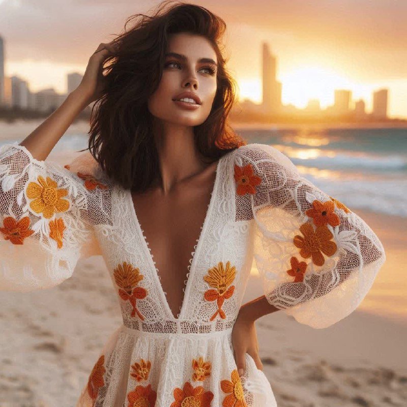 Изящная женщина с фигурой песочных часов демонстрирует восхитительные формы в летнем белом платье, украшенном ярким цветочным орнаментом из ажурной вышивки оранжевого и желтого цветов. Подчеркнутая высокая талия и соблазнительный вырез лодочкой деликатно обрамляют пышную грудь, а тонкие бретельки добавляют легкости силуэту. Большие солнцезащитные очки синего цвета скрывают взгляд, придавая образу загадочности и серьезности. Модель уверенно стоит на фоне живописного заката на песчаном пляже, где горизонт сливается с силуэтами далекого города. Тщательно подобранные детали, такие как изящная кисточка, завершают этот образ, сочетающий в себе чувственность и элегантность. Фотография передает атмосферу безмятежности и красоты, подчеркивая естественные пропорции и грацию женского тела. Это визуальное воплощение летнего настроения, стиля и уверенности в себе, где гармонично сочетаются природная красота и тщательно продуманный дизайн одежды. Белое платье, словно символ чистоты и невинности, контрастирует с насыщенными цветами вышивки, создавая неповторимый визуальный эффект