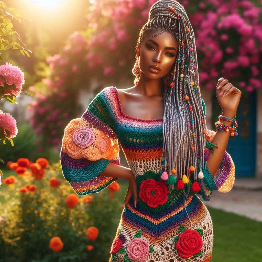 female model, hourglass figure, curvy, voluptuous, ample hips, tiny waist, full bust, shapely body, curvaceus, exaggeded proportions wearing colorful crochet dress with butterfly design, pink blue yellow deep v-neckline, long braided hair styled in loose waves adorned with colorful beads and tassels, red flower on shoulder, striped off-the-THE-THE-THELDER crochet dress, high neckline, elegant and feminine moodod, posing with one hand and other resting on thight #ROLE_CROCHET