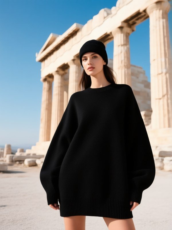 Завораживающий снимок в стиле модной фотографии, где величественные руины греческого храма становятся фоном для современной элегантности. В центре внимания – изящная модель, облаченная в объемный свитер oversize насыщенного цвета, контрастирующий с графическим черным цветом vantablack на головном уборе. Композиция выигрышно подчеркивает детали и текстуры одежды благодаря чистому минималистичному фону, состоящему из древних руин. Игра кислотных цветов создает яркий градиент, а естественное освещение мягко очерчивает фигуру модели, придавая снимку глубину и загадочность. Фотография выполнена в формате рекламного буклета бренда, демонстрируя сочетание классической архитектуры и современной моды. Акцент на чистых деталях и минимализме подчеркивает высокое качество материалов и безупречный стиль. Низкий угол съемки придает снимку динамизм и позволяет зрителю взглянуть на происходящее с новой перспективы, усиливая эффект присутствия и вовлеченности. Фотосессия представляет собой гармоничное сочетание эстетики античности и современности, создавая уникальную визуальную историю о красоте, силе и изысканном вкусе
