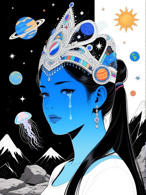 surreal digital artwork of russia woman with blue skin, head adorned in intricate details, surrounded by floating objects like planets, jellyfish, mountains, rocks, sun, long hair tied back, one tear rolling down cheek, focus on face, gradient from black to white creating stark contrast highlighting features, bg is abstract, elaborate headdress fusion of katsuya trada style and patchwork of cosmic elements, planets and stars woven into design, cyberpunk aesthetic, clean and sharp inking, dots art detailing, vibrant energy of lowbrow art style, quality: high #ROLE_TRADA