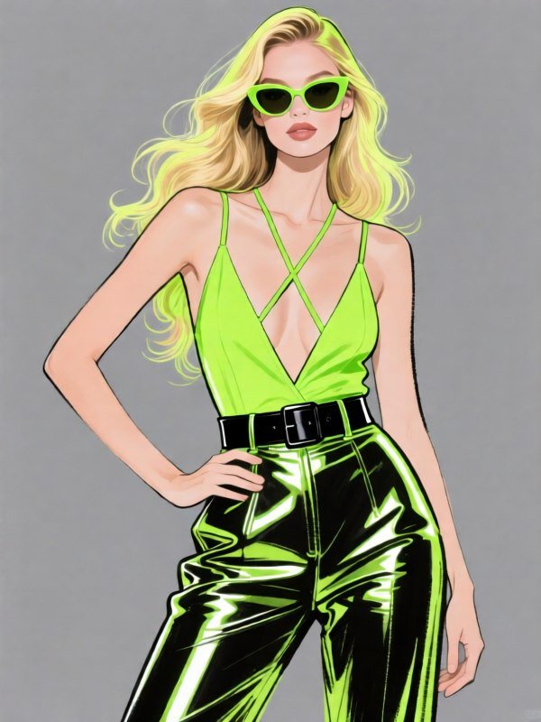 Яркая неоновая иллюстрация в технике туши демонстрирует современную модную модель. В центре внимания – стильный образ: облегающий комбинезон насыщенного неонового зеленого цвета с глубоким вырезом V-образным и тонкими бретелями, элегантно перекрещивающимися на груди. Талию акцентирует изящный черный пояс, подчеркивающий силуэт. В сочетании с комбинезоном – высокие отражающие брюки, добавляющие динамичности и футуристичности луку. Длинные светлые волосы модели волнами мягко обрамляют лицо, а солнцезащитные очки придают образу загадочности и шика. Поза модели выразительна: одна рука грациозно покоится на бедре, другая – на бедре, что создает ощущение уверенности и непринужденной элегантности. Фон выдержан в нейтральном сером цвете, позволяя яркому образу полностью раскрыться и стать главным акцентом композиции. Эта иллюстрация - воплощение современной моды и смелых решений в стиле, сочетающее в себе дерзость неоновых цветов и классическую изысканность силуэта. Кажется, будто модель сошла с подиума модного показа будущего, где технологии и стиль слились воедино, создавая поистине незабываемый образ. Использование туши добавляет работе графичности и подчеркивает детали кроя и фактуру ткани, делая ее еще более привлекательной и запоминающейся