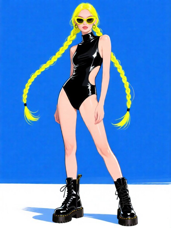 Яркая неоновая иллюстрация, выполненная в технике тушевой графики, представляет собой стильный образ современной модели. Девушка уверенно позирует на фоне насыщенного синего цвета, демонстрируя элегантный черный купальник-комбинезон с вырезом и высоким воротником. Длинные светлые волосы, заплетенные в две эффектные косы, добавляют образу динамики и энергии. Стильные желтые солнцезащитные очки подчеркивают индивидуальность модели, а массивные черные ботинки на толстой подошве придают луку дерзости и бунтарского духа. Использование глянцевых материалов создает ощущение блеска и роскоши, усиливая визуальное воздействие изображения. Студийное освещение и однотонный белый фон акцентируют внимание на деталях образа и создают атмосферу энергии и смелости. Этот образ идеально сочетает в себе элементы моды, искусства и современной культуры, воплощая собой сильный и независимый женский характер. Вся композиция создает ощущение движения и динамики, что делает ее привлекательной для зрителя. Яркие цвета и контрастные детали делают эту иллюстрацию запоминающейся и визуально насыщенной. Это идеальный пример современного стиля в моде, сочетающего элементы уличного стиля и высокой моды
