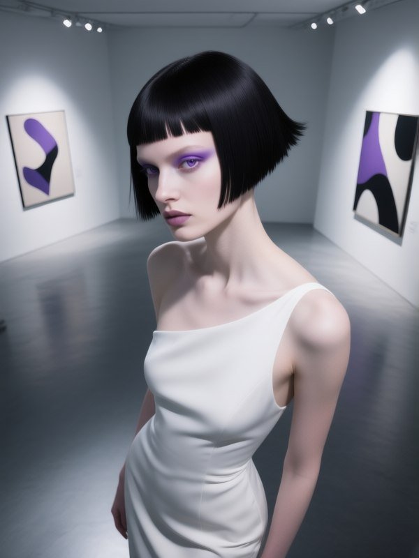 #3. female avant-garde fashion model, aerial view, contemplative pose, alabaster skin, violet iris, jet black bob, edgy undercut, statuesque form, minimalist chic dress, minimalist chic abstract art gallery, spotlight focus, surrealism twist. octane rendering, photographed with a canon eos r5 and rf 50mm f/1.2 usm lens, channeling the vision of alexander mcqueen and max ernest. #Role_Fashion