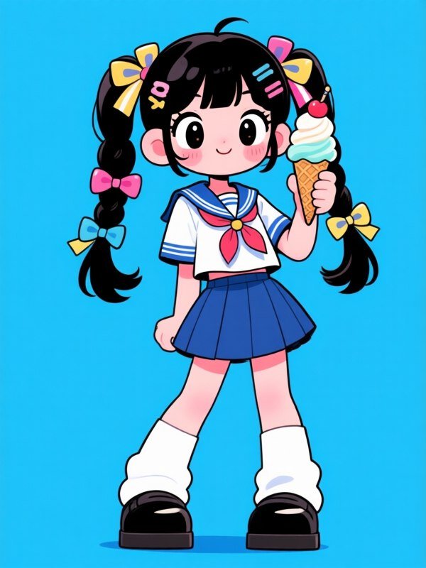 adorable girl with pigtails adorned with ribbons, wearing a sailor-style outfit, holding an ice cream cone, cheerful expression, pop art style, bold colors, solid blue background, inspired by harajuku fashion and kawaii culture, cute cartoon design, vibrant illustration, playful energy, full body portrait #Role_cute_girl