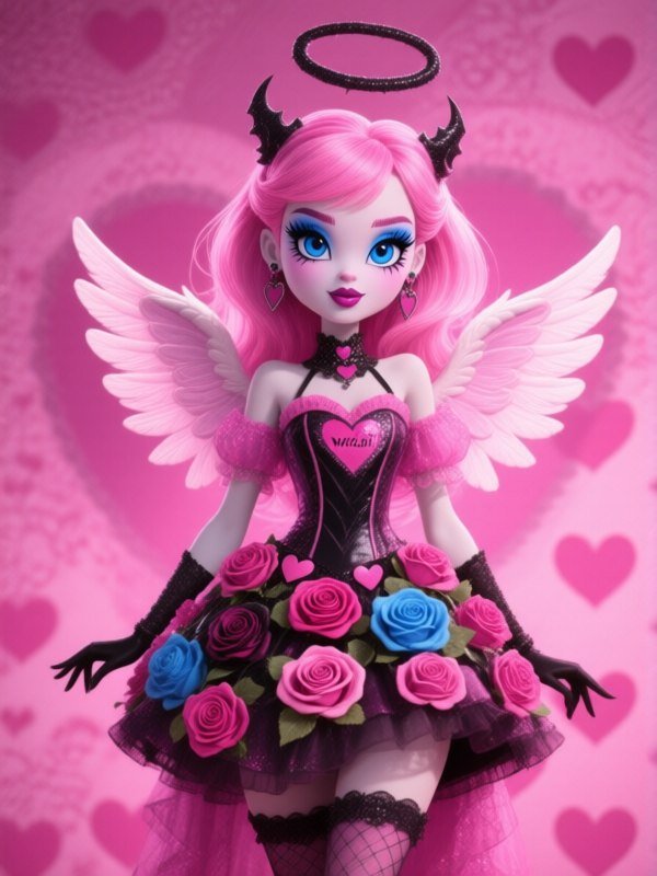 Розовые волосы и ангельские крылья в стиле Монстер Хай с любовными узорами - Картинка, созданная ИИ QWEN