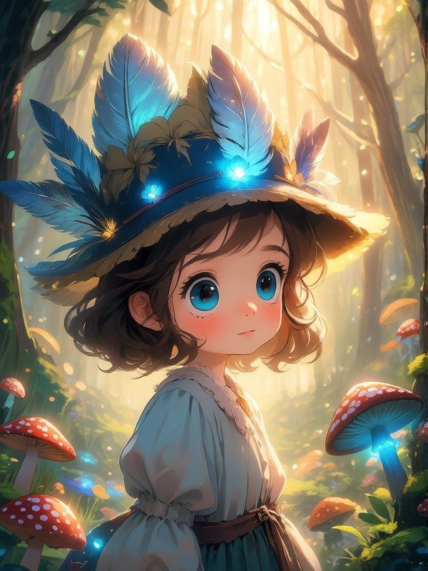 a whimsical girl with large expressive eyes, wearing a magical hat adorned with feathers, standing in a mystical forest, enchanting atmosphere, detailed background with glowing mushrooms, soft lighting, dreamy color palette, inspired by studio ghibli and art nouveau, intricate details, fantasy theme, captivating character illustration #Role_cute_girl