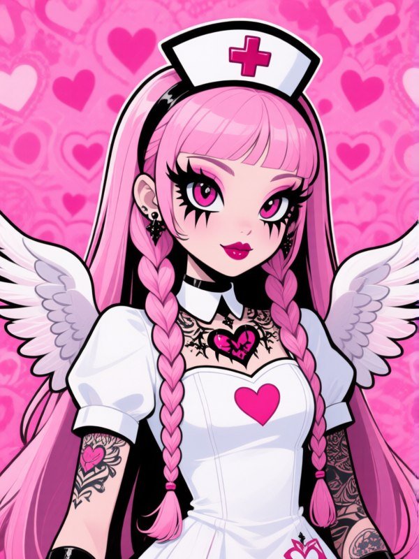 a beautiful tattooed princess, long pastel hair, gothic nurse monster, pink hair with long braids, heart-shaped face with angel wings, hearts on them, cute dress, white makeup, black leshes, angelic designs, pink background with love patterns, vivid colors, text: "angel", by meryle ventures and tim shumate #Role_MONSTER_HIGH