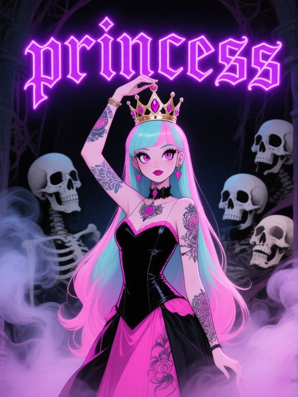 a beautiful tattooed princess with long pastel hair, wearing a black and pink outfit, holds up her crown while standing in front of skulls and smoke, the word "princess" is written in neon purple lettering above, in a vibrant, gothic digital art style #Role_MONSTER_HIGH