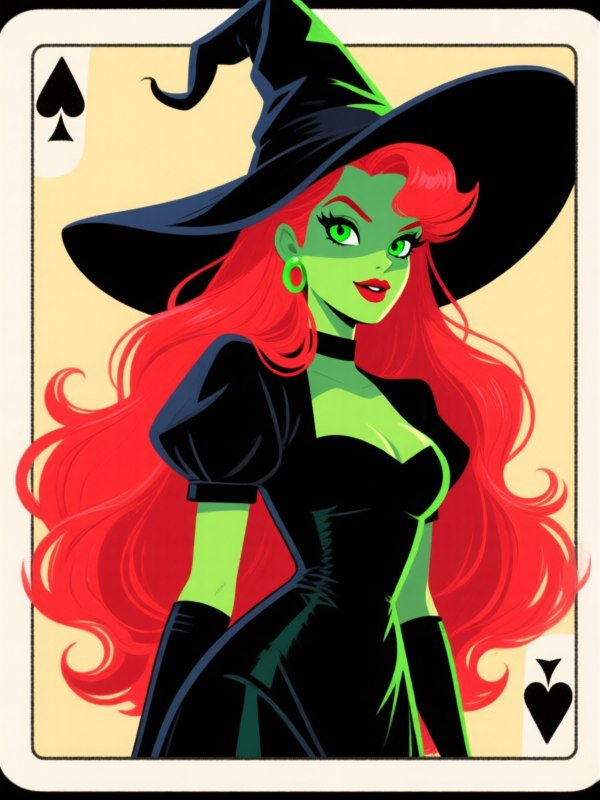 Загадочная колдунья с алыми волосами и ярко-зелеными глазами предстает в образе пин-ап девушки, словно сошедшей со страниц винтажных рекламных плакатов Дж. Си Линденкера. Ее пышные локоны вырываются из-под островерхой шляпы, подчеркивая волшебную сущность и притягательность. Простая композиция фона акцентирует внимание на деталях костюма – элегантном наряде, который сочетает в себе элементы классического колдовского образа и ретро-шарма. Изображение выполнено в технике плоской 2D иллюстрации с минималистичными деталями и приглушенной цветовой палитрой, что создает ощущение легкости и воздушности. Высокое разрешение позволяет рассмотреть мельчайшие элементы рисунка, передающие атмосферу таинственности и загадки. Эта работа представляет собой уникальное сочетание жанров – от классической иллюстрации к современному фэнтези. Идеально подходит для оформления в качестве дизайна карты Таро или обложки книги, посвященной миру магии и волшебства. Стиль исполнения напоминает о лучших образцах графики начала XX века, переосмысленных в контексте современной культуры. В целом, это завораживающее изображение привлекает внимание своей красотой, элегантностью и загадочностью, оставляя после себя ощущение сказки и приключения. Оно способно вызвать широкий спектр эмоций – от восхищения до легкого страха, что делает его особенно запоминающимся и впечатляющим. Идеально подойдет для использования в цифровом искусстве, графическом дизайне или просто как предмет коллекционирования для любителей фэнтези и ретро-стиля
