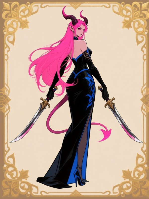 a full-body character design of an elegant and beautiful female demon with long neon pink hair, wearing a black dress with blue accents, holding two daggers behind her back around her, in the style of afk arena and james jean, ornate patterns, beige background with golden details and decoating borders, simple lines, cartoon illustration, high resolution #Role_AFK_ARENA