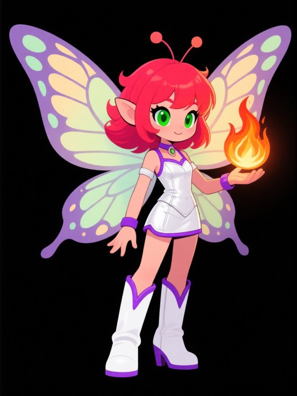 a cute fairy with large butterfly wings, neon red hair, green eyes, wearing white leather with purple trim and white boots, holding a fireball in her hand, reminiscent of fantasy card game art, tarot card design, 2d flat, simple colors, minimalistic design in style of arena #Role_AFK_ARENA