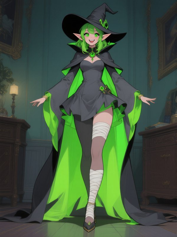 Очаровательная колдунья с изумрудно-зелеными глазами, облаченная в образ пин-ап девушки в стиле Дж. Си. Лейендеккера, предстает перед зрителем во всей своей красе. Фон выполнен в простом и элегантном стиле, имитируя живопись эпохи ар-деко. Изображение выполнено в анимешной манере, с акцентом на детали и выразительность лица. На лице колдуньи играет приветливая улыбка, а на ноге заметна повязка, добавляющая образу легкую загадочность и намек на пережитые приключения. Уши заострены, как у эльфа, что подчеркивает ее неземную природу и принадлежность к волшебному миру. Стиль изображения вдохновлен визуальным оформлением популярной мобильной игры Afk Arena в сочетании с характерными чертами рисунка Мобиуса, создавая уникальную атмосферу сказочности и притягательности. Вся композиция создает впечатление легкости, грации и неподдельной радости, заставляя зрителя задержать взгляд на этом ярком и запоминающемся образе волшебной красавицы. Эта работа представляет собой гармоничное сочетание различных художественных стилей и направлений, создавая поистине завораживающий визуальный опыт. Детализированная проработка персонажа и внимания к деталям делают это изображение по-настоящему особенным и привлекательным для ценителей аниме, фэнтези и классической иллюстрации
