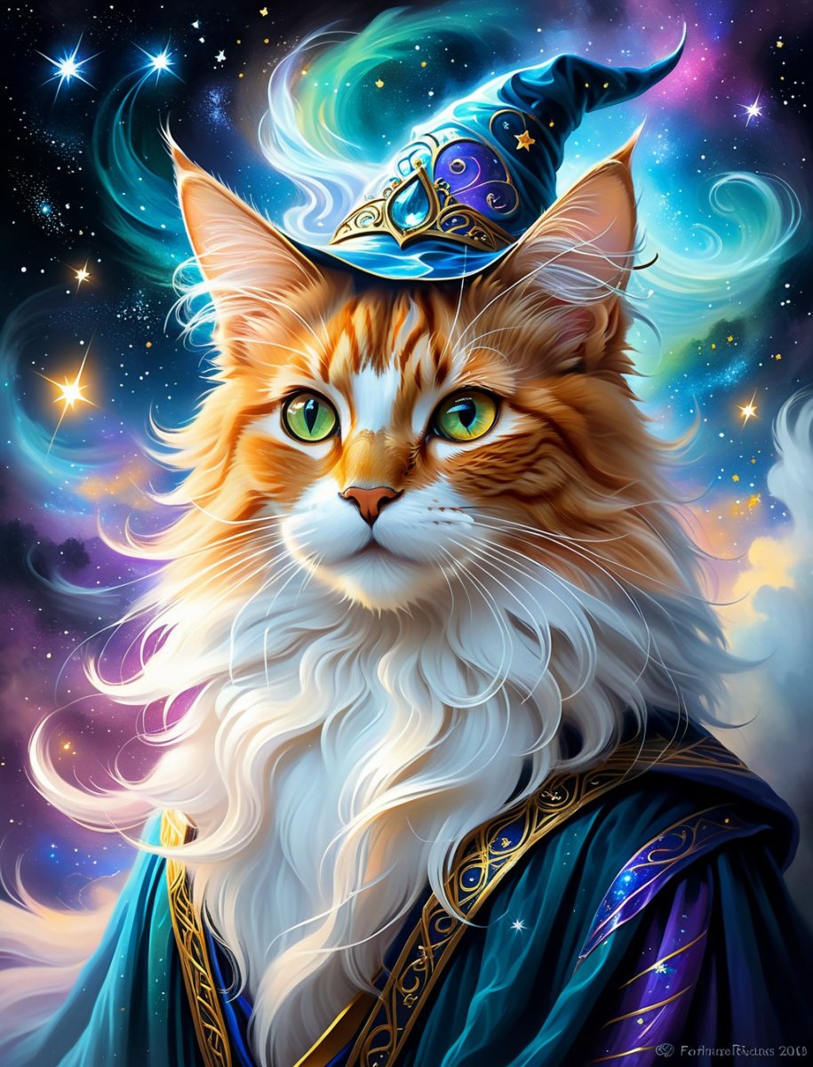 A wizard cat with a kind gaze and magical, lush whiskers; from the whiskers rises a swirling mist as if extensions rising in different directions into the heights – stars flying away in an endless stream into open space. Portrait cat image, strictly acrylic paints, super detailed and sharp, so that every small hair is visible.